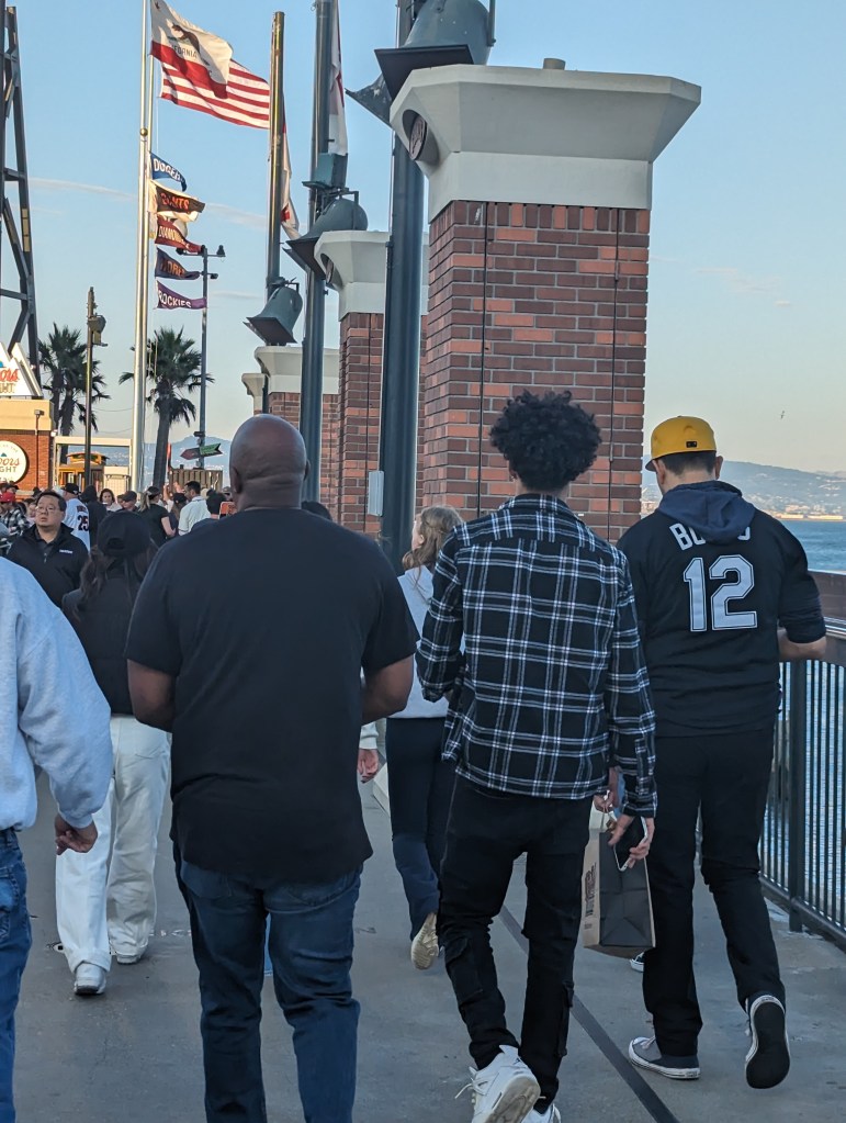 Even though I’m not a big Bruce Lee fan, I am a fan of swag, so i have signed up for the Bruce Lee Night T-shirt, for which I have to walk up to the third deck distribution center; on the way down the arcade, Eric points out that we can hear the water cannon in the brick towers gurgling and sloshing hollowly, waiting to be let loose for a Giants homer (as it happens, they will be waiting for a while). Once we get there, it turns out that there are only two shirts left, and they’re both smalls. My time in small shirts is well over, but it was a nice walk anyway, and we stop in to take a look out over the Bay from 324 or so, which is a pleasing panorama. I never tire of noticing that there is not a bad view in the place.